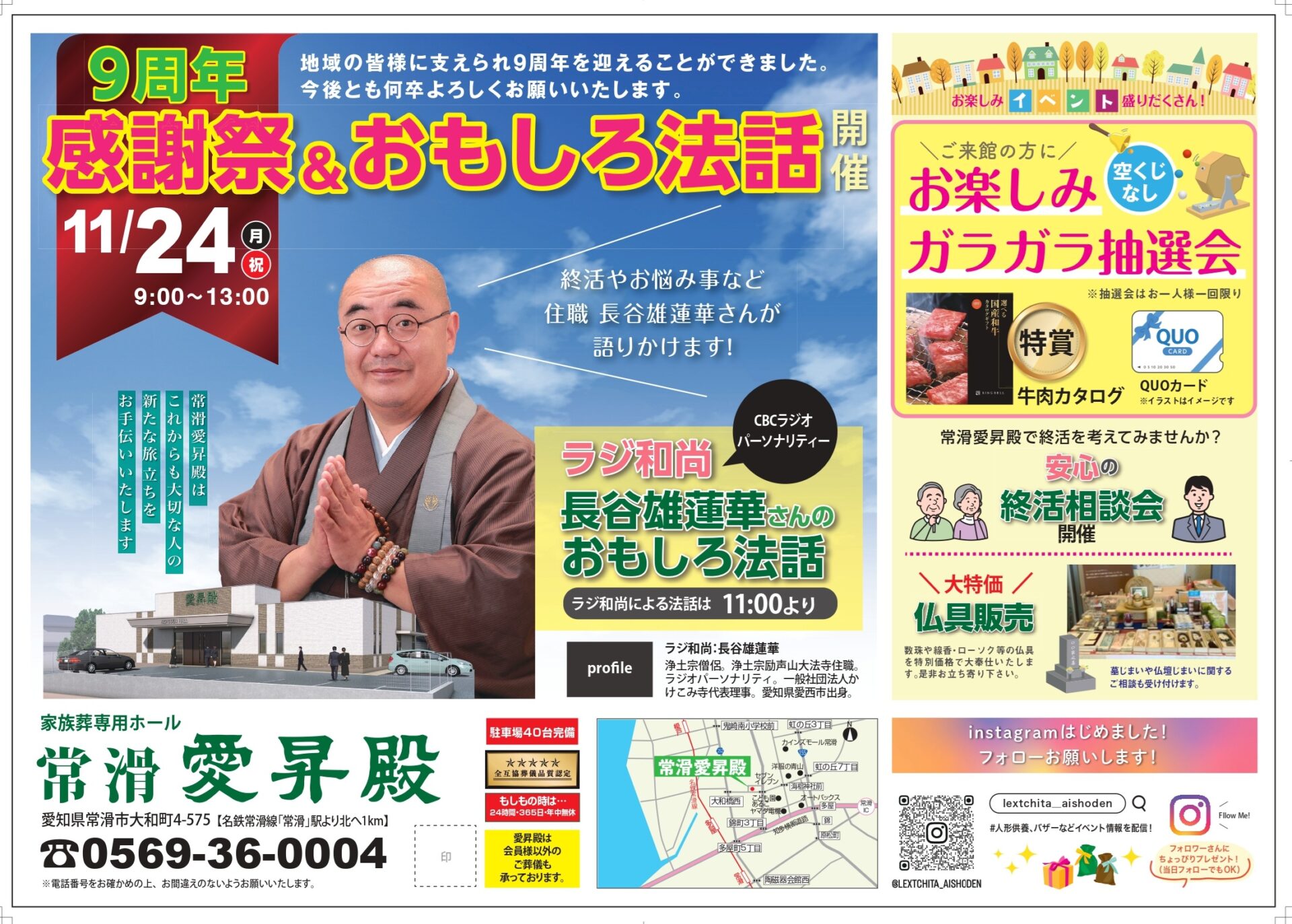 常滑愛昇殿にて【感謝祭&おもしろ法話】を開催いたします。 ※11月9日(日)、20日(木)常滑地区に中日...