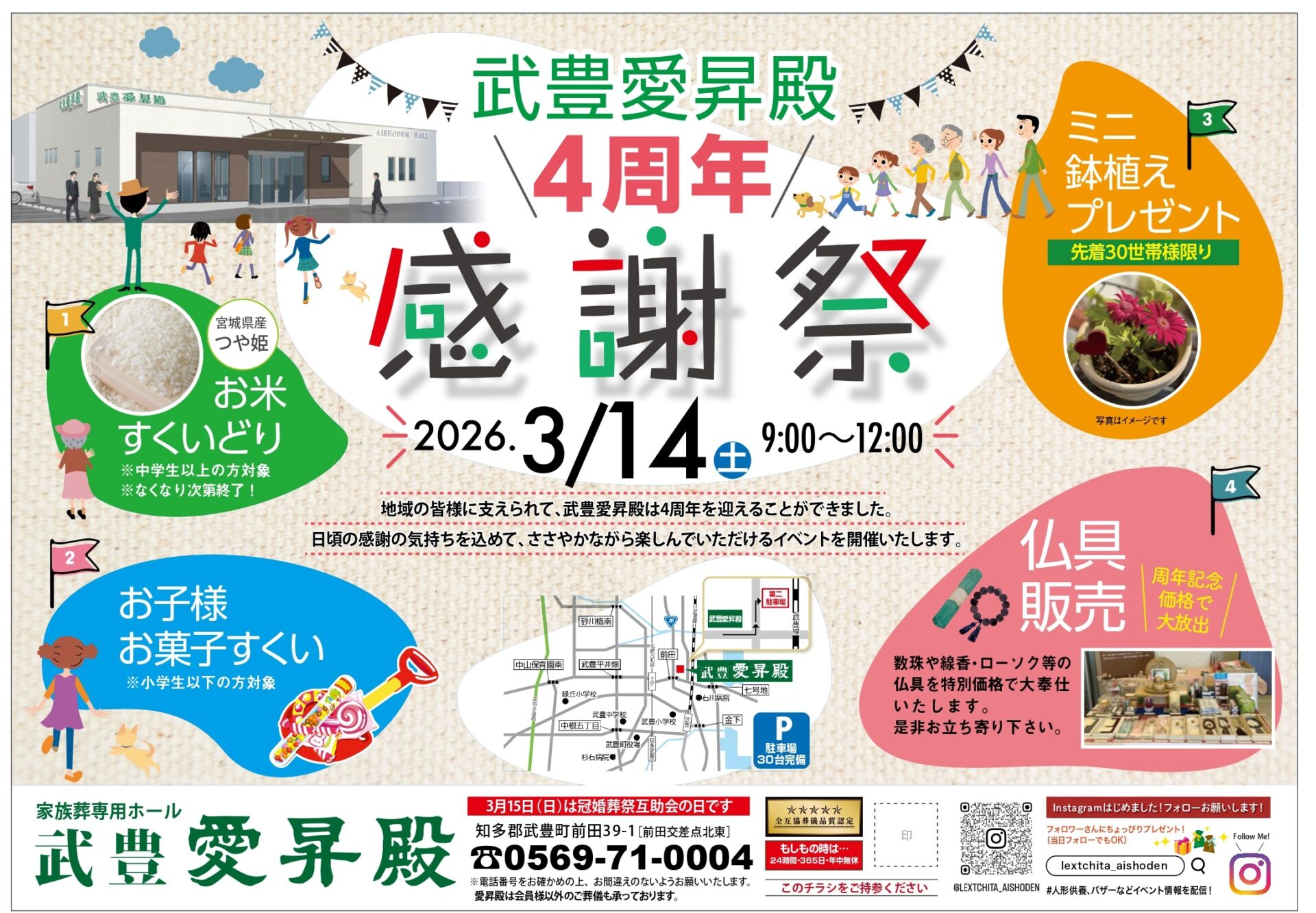 武豊愛昇殿にて【オープン4周年・感謝祭】を開催いたします。 ◆3月15日は「冠婚葬祭互助会の日」です◆ ...